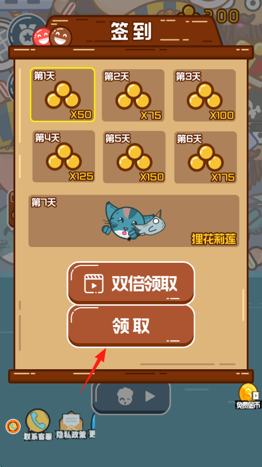 1、開局與福利主界面點播放鍵開始,有“簽到”系統(tǒng),累計簽到領(lǐng)金幣(第1天50)、角色(第7天“貍花莉蓮”)。