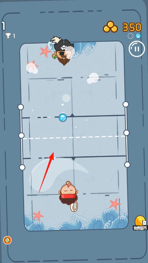 2、核心對戰(zhàn)類似網(wǎng)球?qū)?zhàn),控制角色(紅帶海盜),擊打藍色小球,在場地內(nèi)對抗,將球打入對方區(qū)域得分。