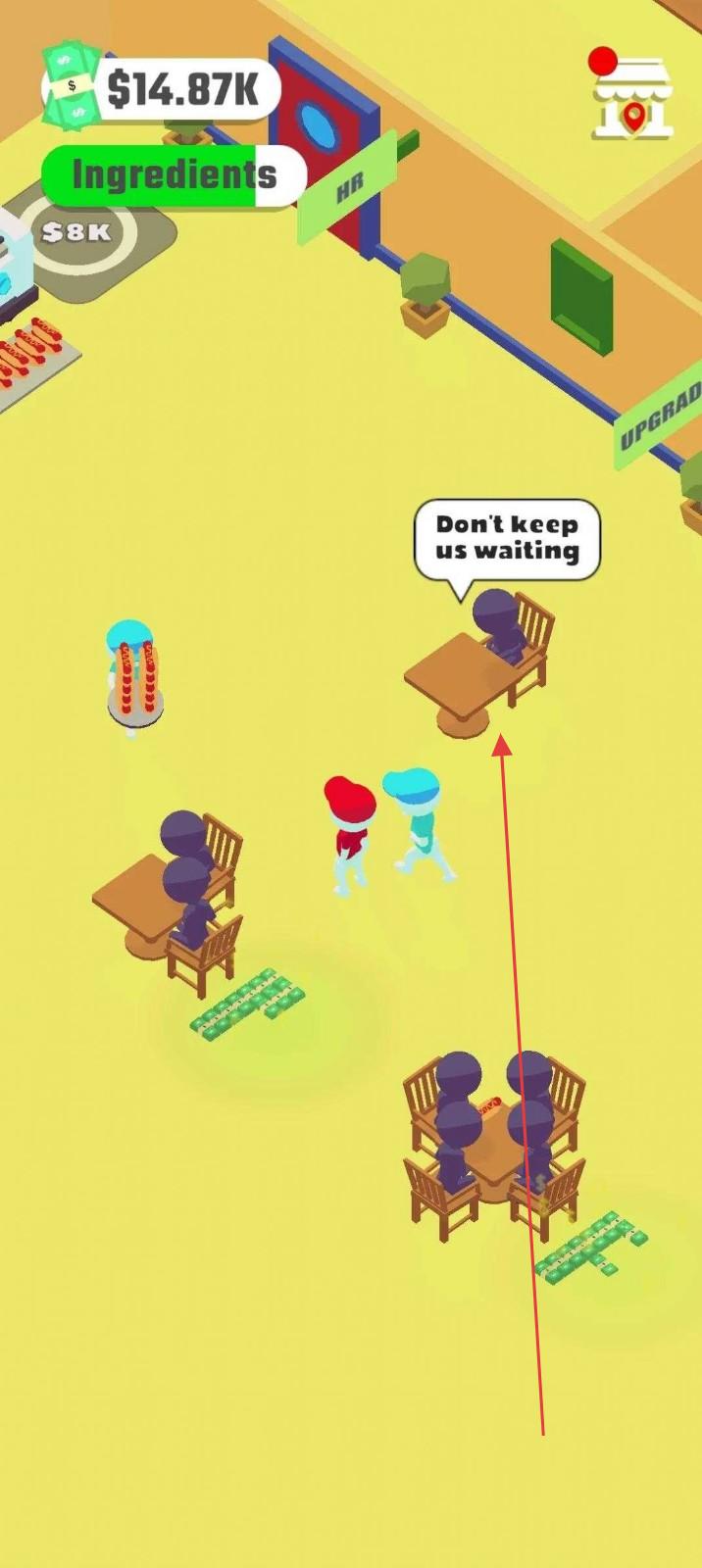 1、顧客進(jìn)店(如紫色小人),顯示“Don'tkeepuswaiting”,操控服務(wù)員(紅帽等)及時(shí)接待。