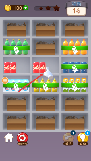 2、整理貨架:移動(dòng)同類(lèi)型商品(如紅色可樂(lè)罐),使其成組擺放(用綠色標(biāo)簽標(biāo)記)。