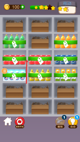 3、完成任務(wù):通過(guò)移動(dòng)、歸位商品,達(dá)成貨架整齊度目標(biāo)(星級(jí)評(píng)定),通關(guān)。