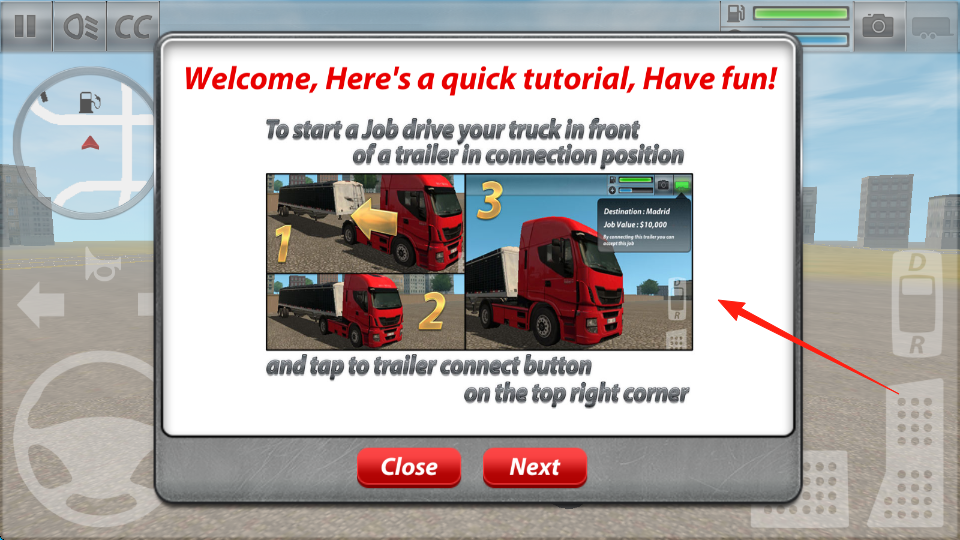 2、按教程指引,操控卡車到掛車前,連接掛車,開(kāi)啟貨物運(yùn)輸旅程。