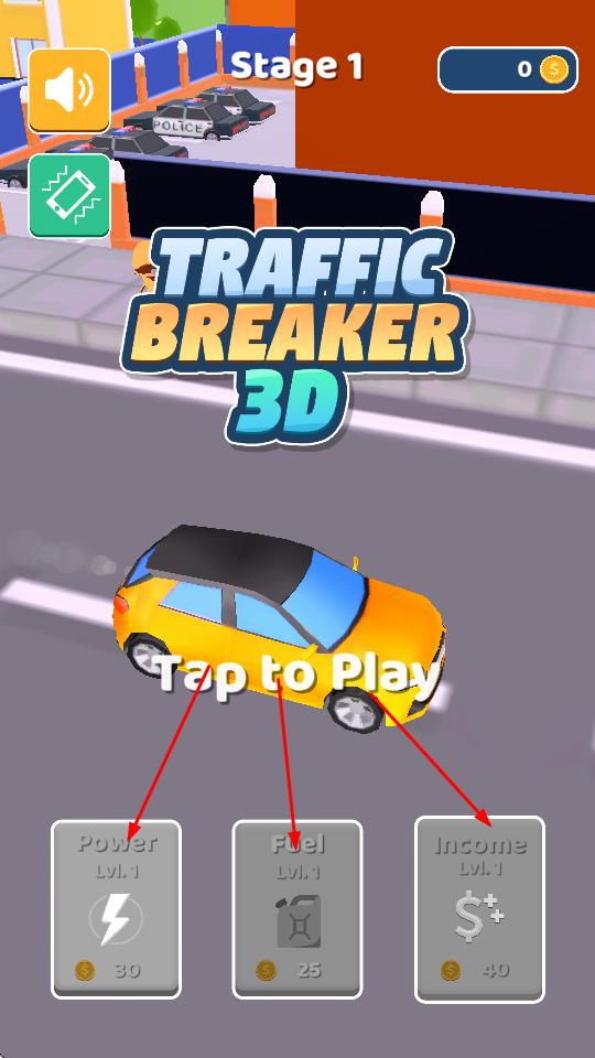 2、游戲中有金幣資源,玩家可花費金幣升級“Power”“Fuel”“Income”等屬性,提升汽車性能和收益。