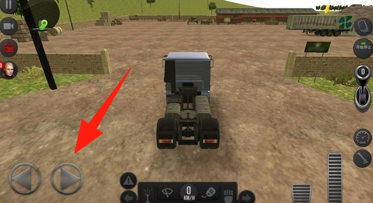 1、在駕駛界面,點擊【箭頭】指向的左右轉(zhuǎn)向按鈕,操控卡車行駛方向。