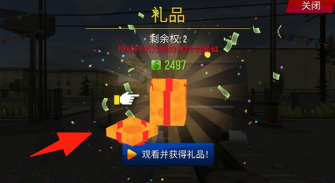 2、遇到禮品界面,點擊【箭頭】指向的“觀看并獲得禮品!”按鈕,獲取游戲獎勵。