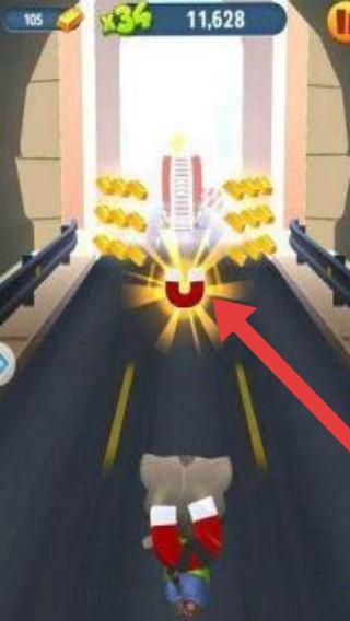 3、畫(huà)面中角色正在奔跑,上方顯示關(guān)卡進(jìn)度為105,金幣倍數(shù)為36,金幣數(shù)量為11,628,紅色箭頭所指是磁鐵道具,這種道具可幫助角色自動(dòng)吸附周圍金幣。