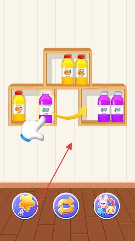1、進(jìn)入游戲后,觀察初始貨架上的商品排列,尋找三個(gè)相同的商品進(jìn)行消除,完成首關(guān)任務(wù)熟悉基本玩法。