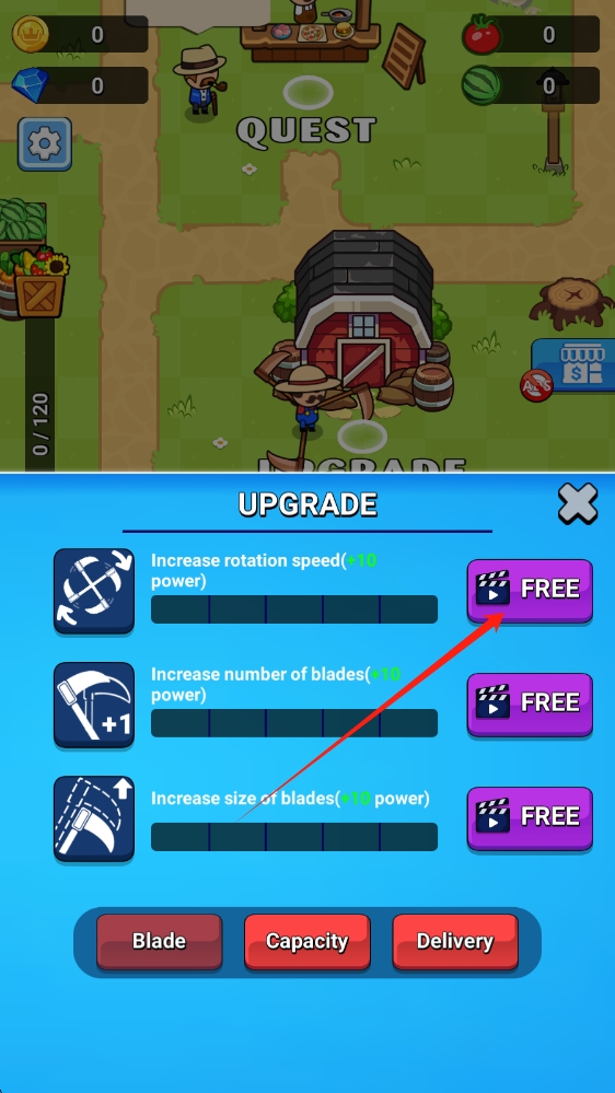 3、成長(zhǎng)系統(tǒng):通過(guò)完成訂單獲得經(jīng)驗(yàn)值提升等級(jí),解鎖新刀片與農(nóng)具,使用金幣購(gòu)買基礎(chǔ)升級(jí),鉆石可購(gòu)買高級(jí)功能與加速成長(zhǎng),支持觀看廣告免費(fèi)獲取隨機(jī)資源。