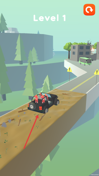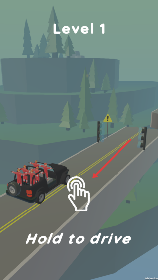 1、長按屏幕“Hold to drive”區(qū)域,控制黑色越野車啟動,沿道路開啟Level1挑戰(zhàn),把控長按持續(xù)時長。
