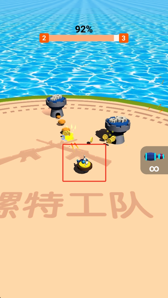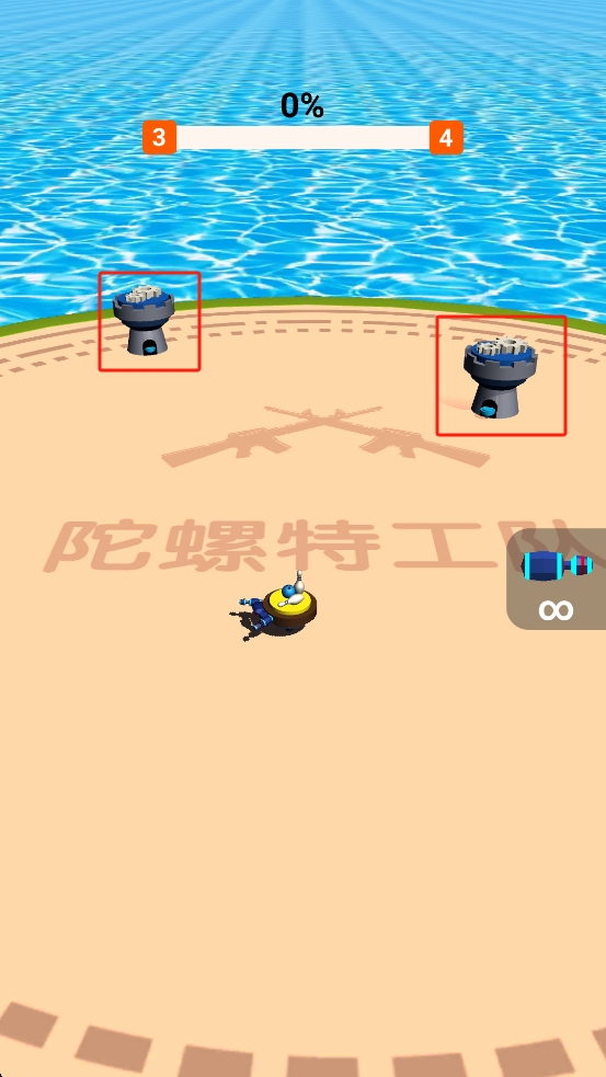 1、開局在沙灘場景,操控陀螺移動,優(yōu)先瞄準(zhǔn)兩側(cè)炮臺,規(guī)劃移動路徑,逐個擊破炮臺推進(jìn)進(jìn)度。