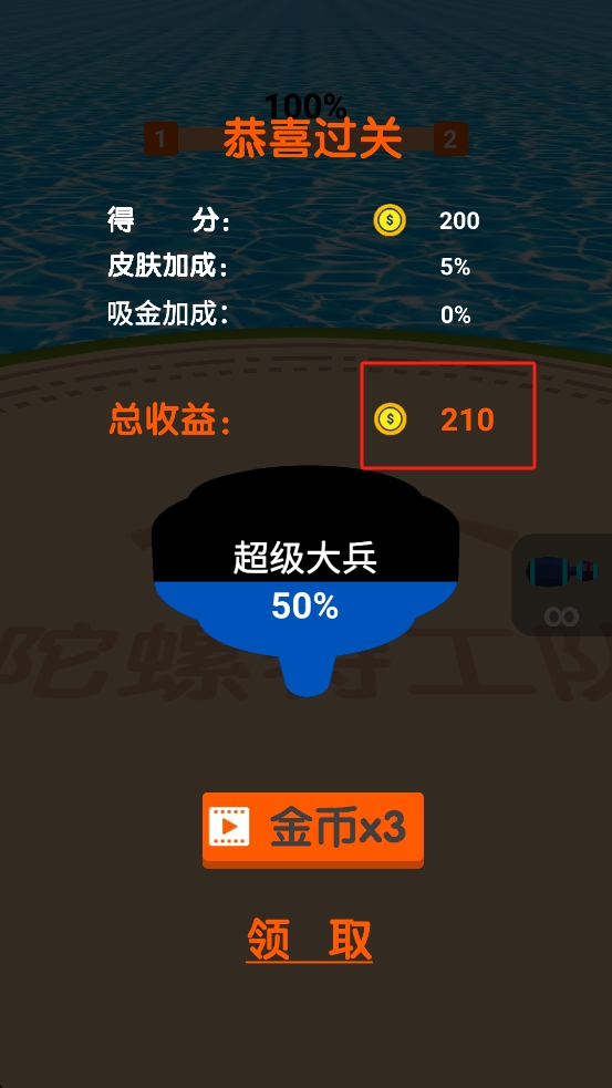 3、成功通關(guān)后可獲得金幣等獎勵,這些獎勵能用來購買高級槍械或子彈,或是加速指定陀螺的解鎖進(jìn)度,讓對戰(zhàn)更從容。