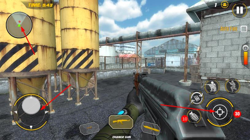 1、在戰(zhàn)場場景,用左側(cè)搖桿移動(dòng)角色,右側(cè)按鍵射擊、扔手雷,根據(jù)小地圖找敵人。