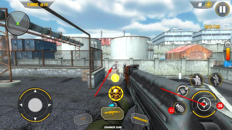 2、瞄準(zhǔn)敵人進(jìn)行攻擊,使用油桶或者建筑當(dāng)做掩體,完成擊殺任務(wù)。