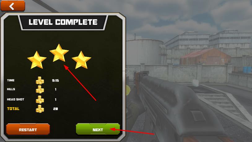 3、通關(guān)后,顯示LEVEL COMPLETE界面,獲星級評價(jià),金幣,點(diǎn)擊NEXT進(jìn)入下一關(guān)。