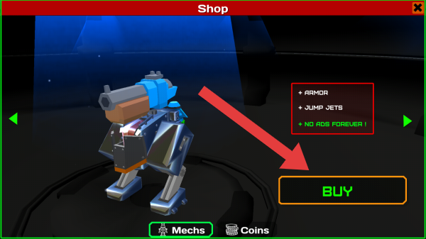 2、功能按鈕BUY購買,可進行購買機甲,下方有Mechs機甲、Coins金幣分類標識,可根據(jù)提示操作。
