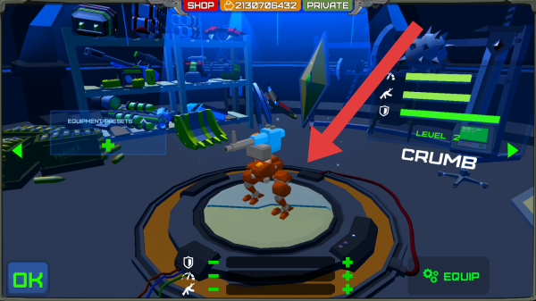 3、機甲名為CRUMB,可看到LEVEL相關(guān)顯示,界面有裝備等操作按鈕,用于機甲調(diào)試與裝備設(shè)置。