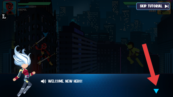 1、上方有SKIPTUTORIAL跳過教程按鈕,下方有歡迎,新英雄!文字,背景是夜晚城市建筑,營造超級英雄戰(zhàn)斗氛圍。