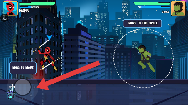 2、根據(jù)提示:拖動移動、移動到圓圈處進行操作,夜晚城市背景,有高樓建筑,呈現(xiàn)格斗對戰(zhàn)前的移動指引環(huán)節(jié),屬于教程或戰(zhàn)斗準備階段。