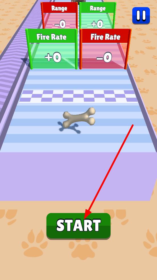 1、點(diǎn)擊“START”啟動(dòng)游戲,道具沿賽道自動(dòng)滾動(dòng),遇到屬性門(mén)Range、Fire Rate時(shí),選擇進(jìn)入對(duì)應(yīng)門(mén)獲取增益。
