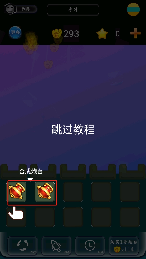 1、觀察界面下方兩個(gè)紅色炮臺(tái),跟隨指引完成合成操作,跳過(guò)教程推進(jìn)流程,解鎖炮臺(tái)合成玩法,開(kāi)啟戰(zhàn)斗布局基礎(chǔ)。