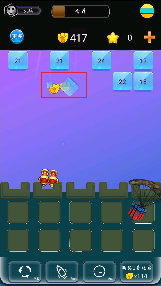 2、操控合成炮臺(tái)攻擊上方藍(lán)色方塊,擊破后獲取元寶資源,同時(shí)留意右側(cè)降落傘禮包,爭(zhēng)取更多收益助力炮臺(tái)發(fā)展。