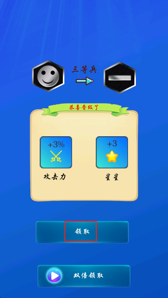 3、晉升三等兵后,點(diǎn)擊中間領(lǐng)取按鈕,獲取攻擊力加成與星星獎(jiǎng)勵(lì),提升角色屬性,為后續(xù)戰(zhàn)斗積累優(yōu)勢(shì)。