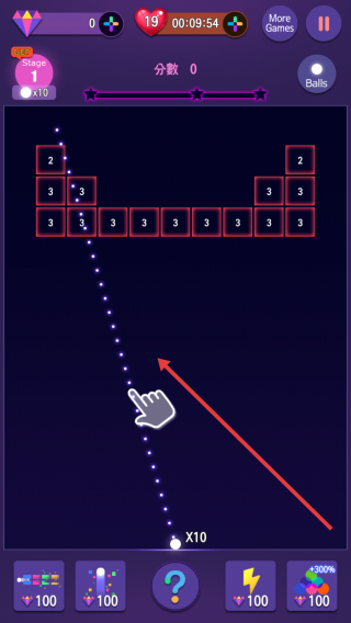 1、游戲開始,輕按屏幕調(diào)整發(fā)球角度,讓小球發(fā)射后撞擊帶有數(shù)字的方塊,方塊數(shù)字代表需撞擊次數(shù),以此得分。