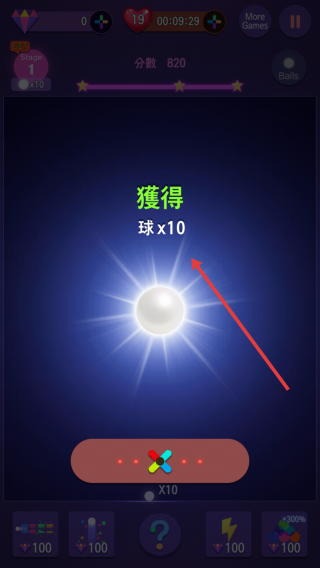 2、游戲過程中,會隨機獲得道具獎勵,如圖中獲得10個球,可增加發(fā)球數(shù)量,助力更高效撞擊方塊拿分。