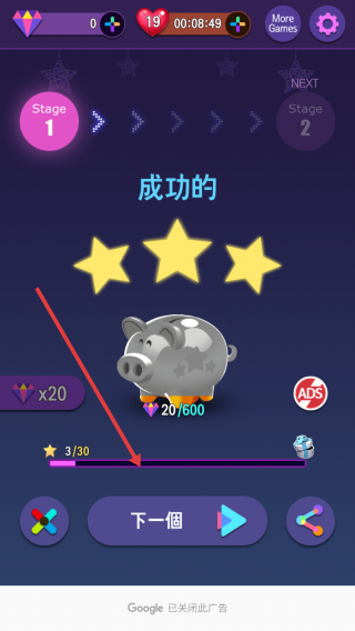 3、成功通關(guān)后,會顯示星級評價和獎勵,點擊下一個按鈕,可進入下一關(guān)挑戰(zhàn),體驗更具難度的關(guān)卡內(nèi)容。