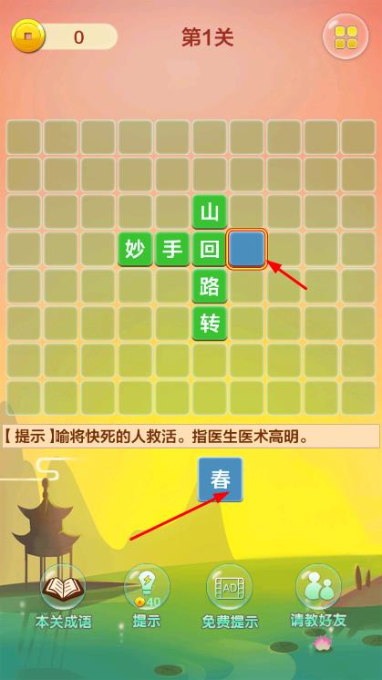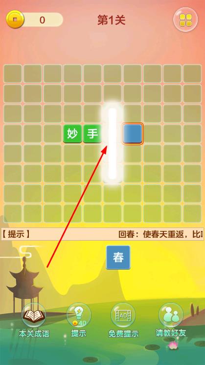 1、進(jìn)入關(guān)卡1,根據(jù)界面已有的成語(yǔ)字塊和下方提示字,拖動(dòng)提示字到合適的空白方格處,填充成語(yǔ)。