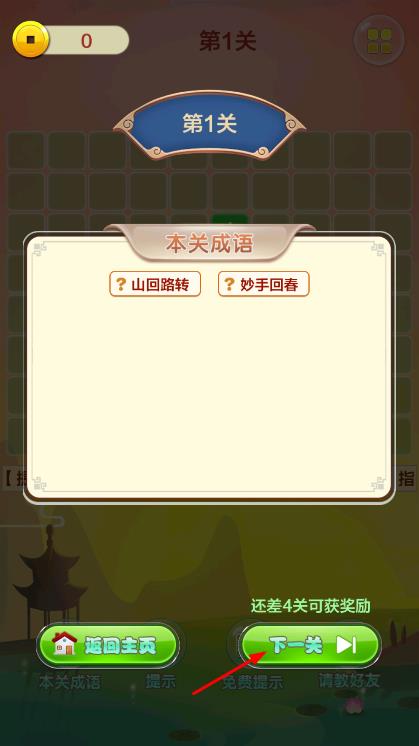 3、成功完成當(dāng)前關(guān)卡成語(yǔ)填字,點(diǎn)擊下一關(guān)繼續(xù)挑戰(zhàn)。