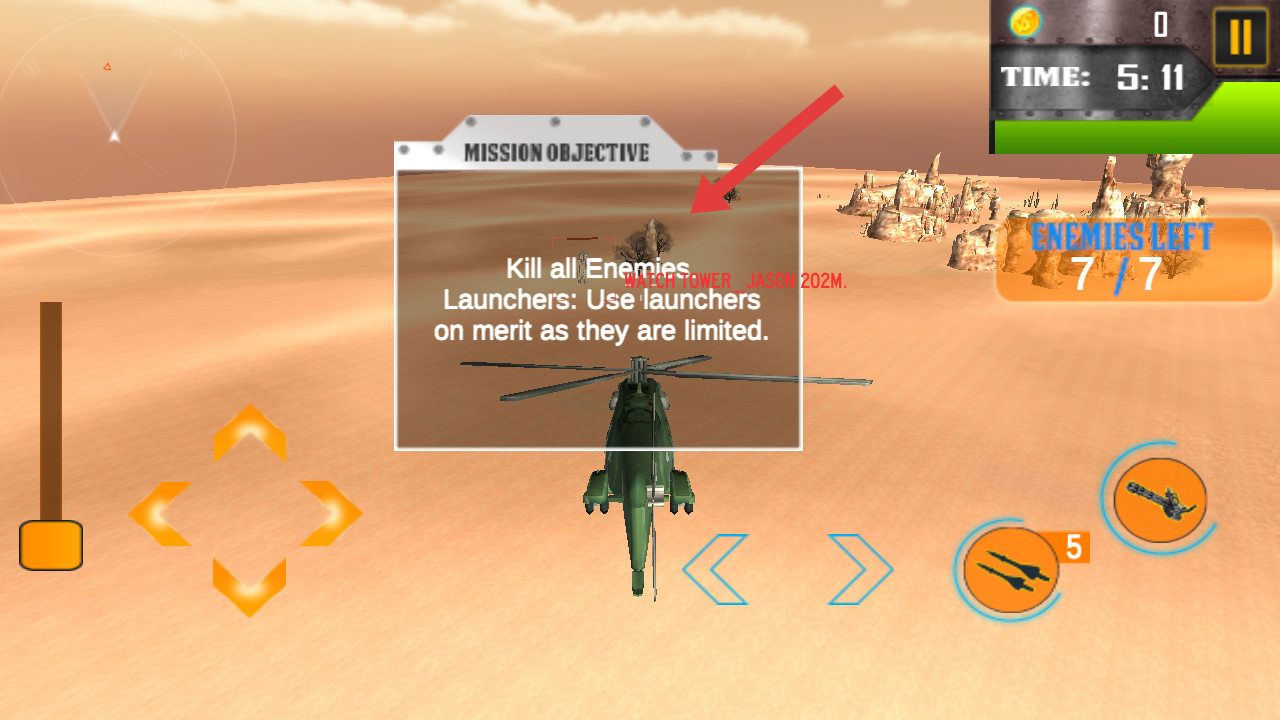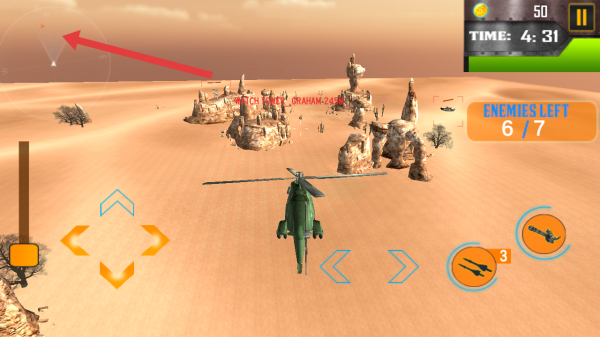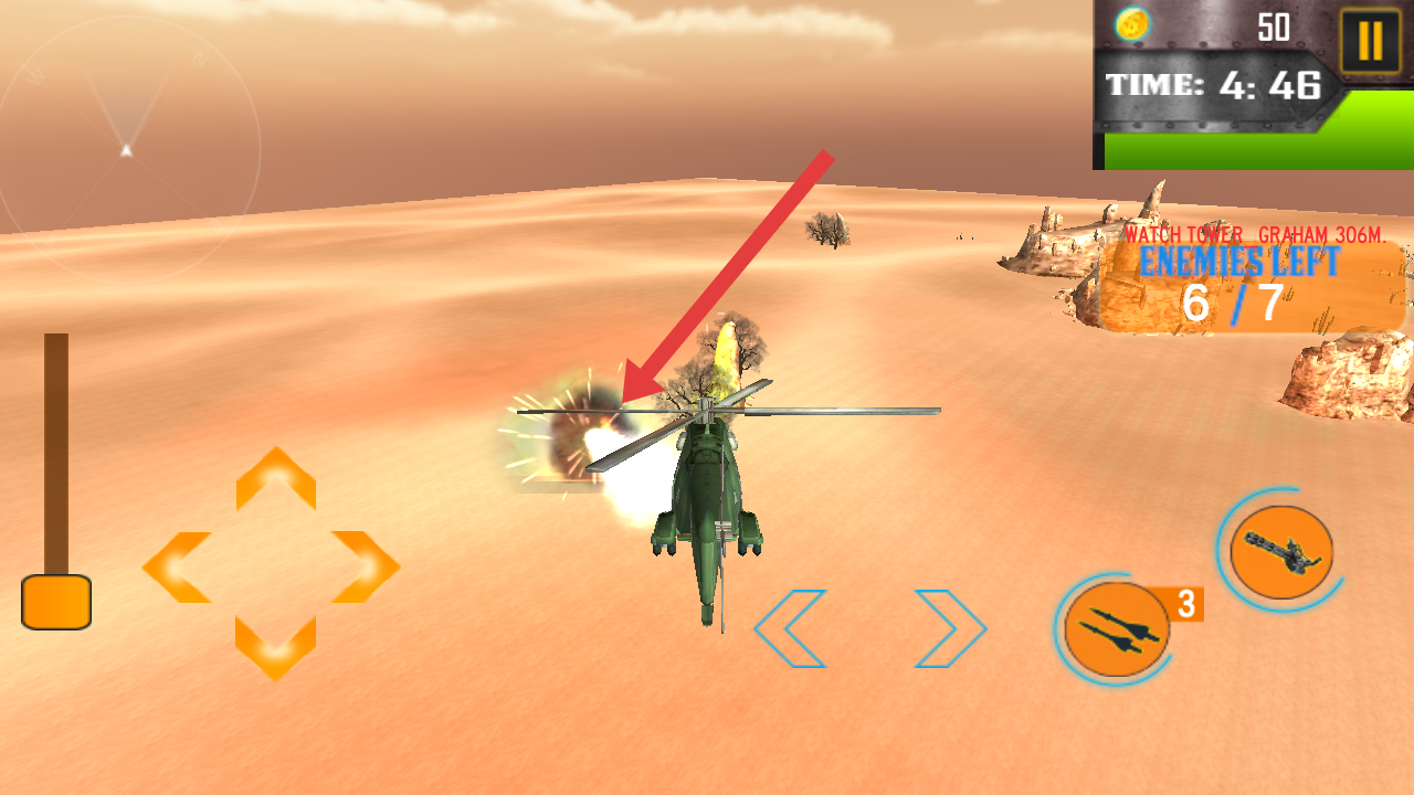 2、操控直升機(jī),點(diǎn)擊武器按鍵攻擊地面敵人,借助火力消滅對面目標(biāo),降低ENEMIES LEFT的計(jì)數(shù)。