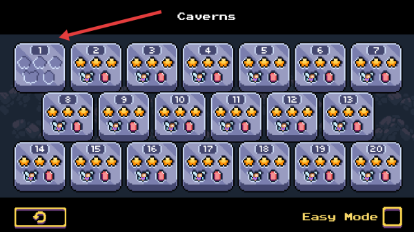 1、主界面點(diǎn)擊TAP TO START,進(jìn)入關(guān)卡列表選Caverns章節(jié)1號(hào)關(guān)卡,開啟像素洞穴場(chǎng)景冒險(xiǎn)流程。