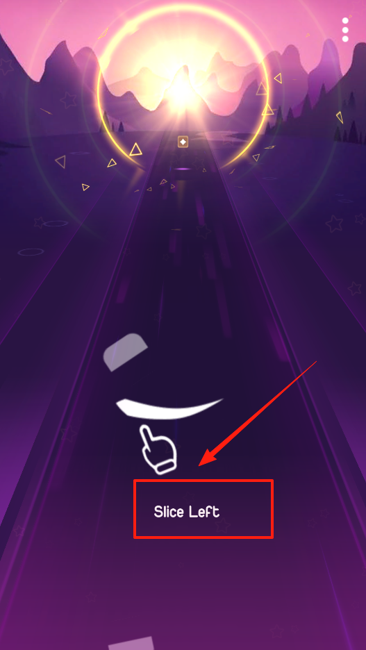 2、教程里出現(xiàn)Slice Left提示,路上有節(jié)奏方塊過來,當方塊到對應位置快速向左滑動屏幕,用切的動作讓角色砍中方塊,跟著音樂節(jié)奏操作,別讓方塊溜走。