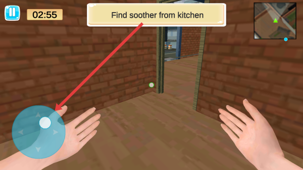 3、依據(jù)任務(wù)提示,通過(guò)左側(cè)虛擬搖桿操控角色移動(dòng),前往廚房尋找安撫奶嘴,在限時(shí)內(nèi)完成任務(wù)推進(jìn)游戲。