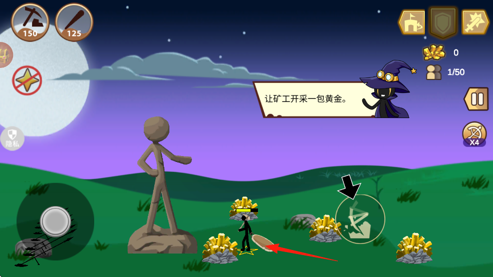 3、按指引操作,如安排礦工開采黃金獲取資源,操控火柴人角色,利用資源發(fā)展、戰(zhàn)斗摧毀目標(biāo)。
