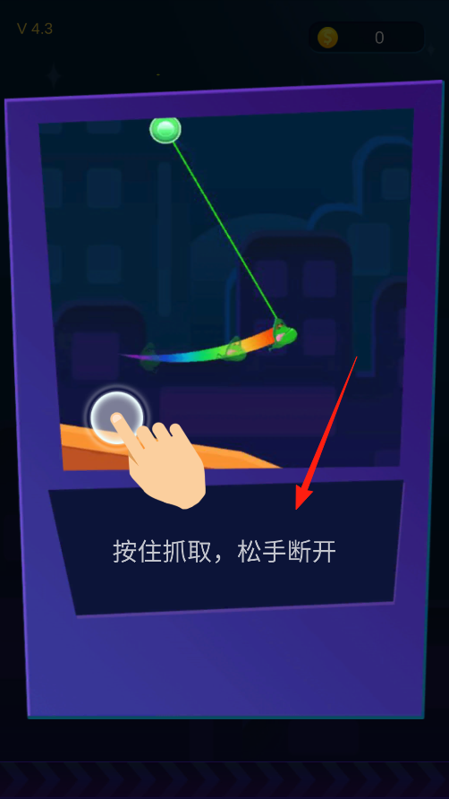 2、按住圓形按鈕能讓鉤子抓住東西,松開手指就會斷開連接,綠色小球會跟著你的操作擺動,試著控制它去觸碰那些模糊的背景物體吧。