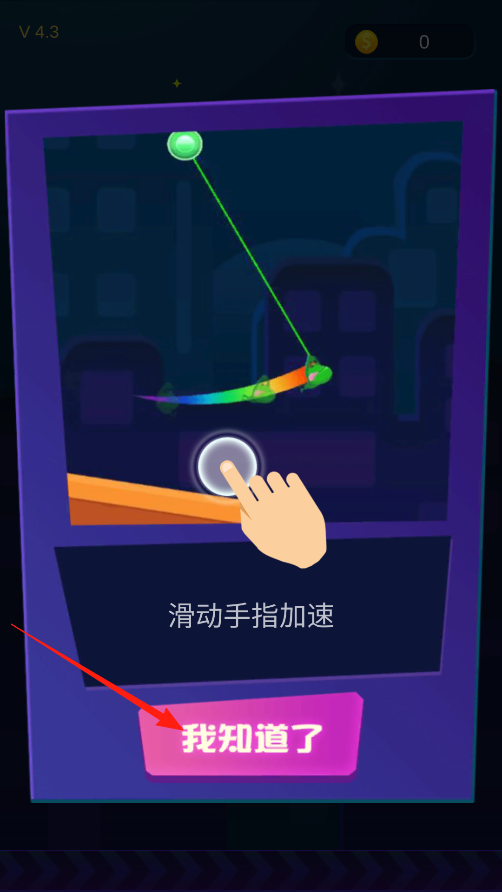 3、滑動圓形按鈕可以給彈弓蓄力,綠色小球會隨著你的滑動速度改變飛行距離,玩之前記得看操作提示,點我知道了就能開始實戰(zhàn)啦。