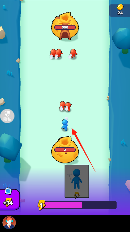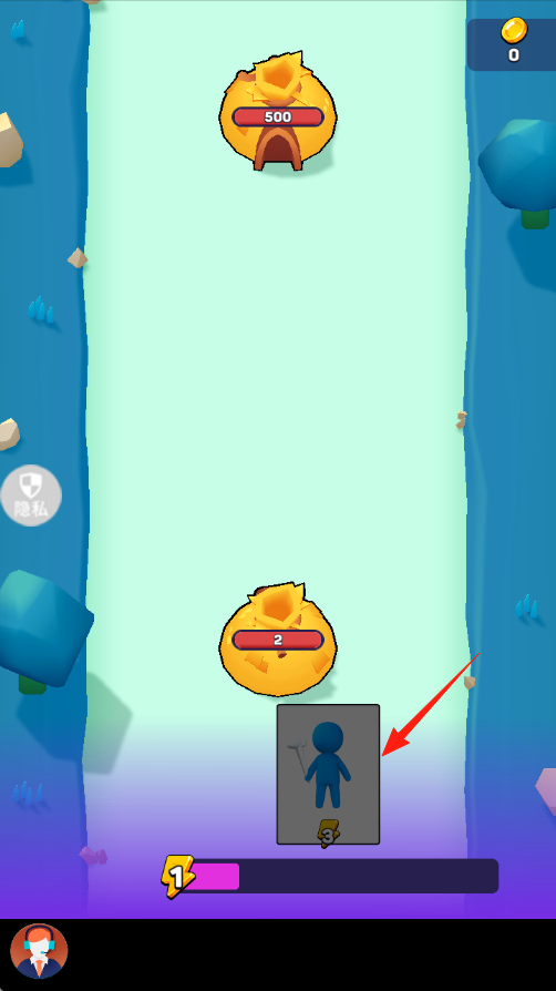 1、操控藍(lán)色小人,目標(biāo)是攻打上方血條為500的建筑,下方建筑血條為2,可生產(chǎn)單位初始藍(lán)色小人。