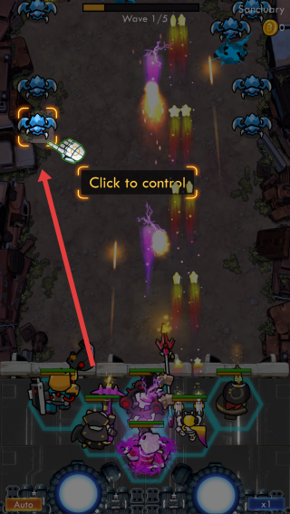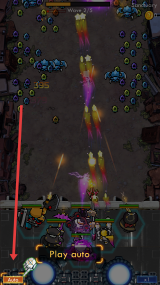 2、點(diǎn)擊左下角Auto按鈕,開啟自動戰(zhàn)斗模式,讓防御塔自主攻擊敵人,輕松應(yīng)對Wave2的攻勢。