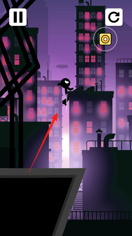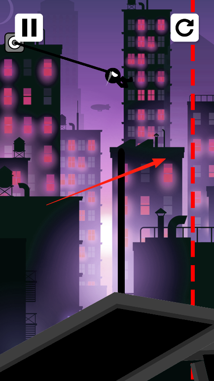 3、按箭頭指引方向,發(fā)射繩索至建筑,完成蕩跳、攀爬,持續(xù)推進關卡,躲避危險。