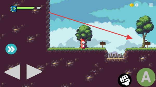 3、操控角色在草地地形移動,利用左右按鍵跨越溝壑,前往箭頭指向的區(qū)域探索新內(nèi)容。