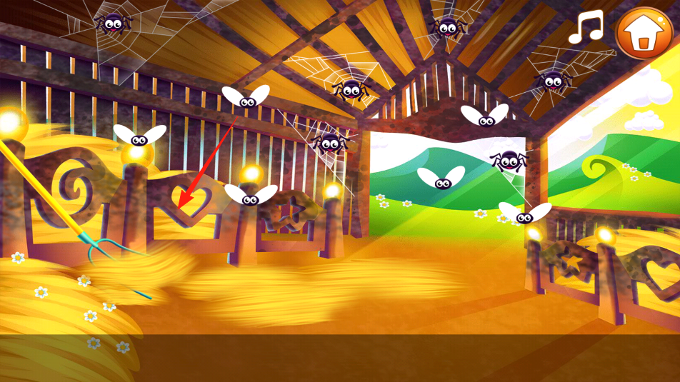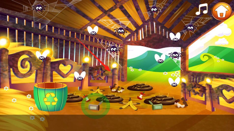 1、進入谷倉場景,到處是垃圾蒼蠅和蜘蛛,看到地上的瓶子香蕉皮,用手指拖到綠色回收桶里,清理垃圾,讓谷倉變干凈,還能順手趕趕亂飛的蒼蠅。