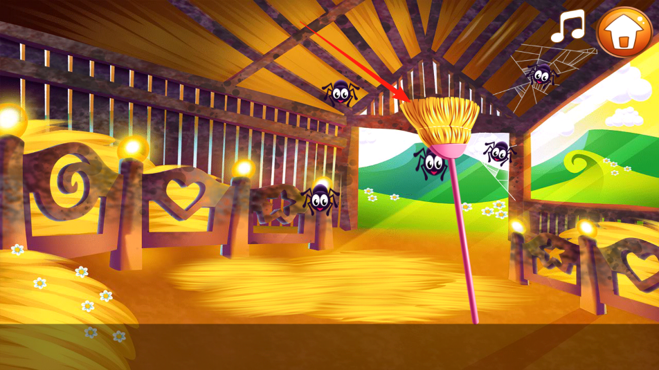 3、垃圾干草都收拾好,剩下蜘蛛在房梁,拿出粉色掃帚,點蜘蛛,用掃帚把它們掃下來趕出去,把谷倉里的蟲子都清理干凈,讓谷倉徹底變整潔,完成打掃任務(wù)。