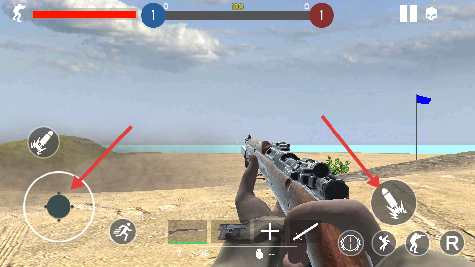 1、通過虛擬搖桿控制角色移動,滑動屏幕調(diào)整射擊視角。