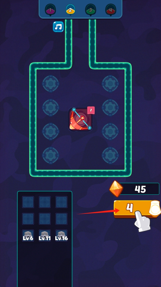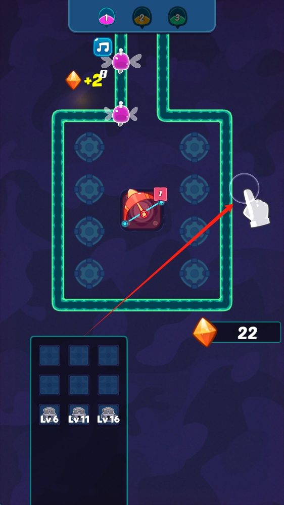 1、關(guān)卡地圖界面,跟隨指引操作,收集鉆石,推進(jìn)綠色路徑關(guān)卡,積累資源,點擊射擊。