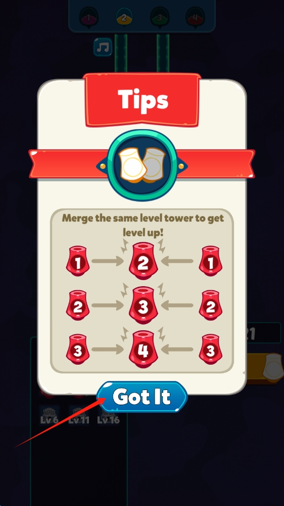 3、提示界面,點擊Got-It,牢記合并同等級塔升級規(guī)則,開始搭建升級塔防,點擊獲得。