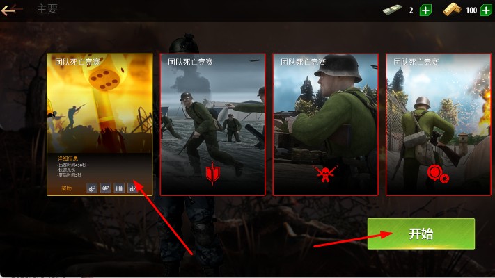 1、進(jìn)入主界面的團(tuán)隊死亡競賽模式中,選擇想要參與的戰(zhàn)斗模式,點擊開始進(jìn)入戰(zhàn)斗場景。