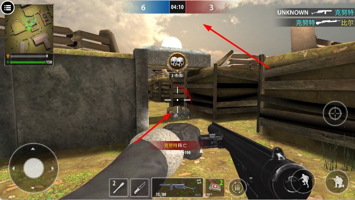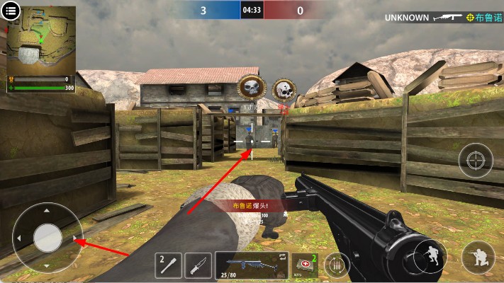 2、在戰(zhàn)斗場景里,通過左側(cè)的虛擬搖桿控制角色移動,右側(cè)的按鈕控制射擊、切換武器等操作,觀察小地圖,尋找敵人位置,瞄準(zhǔn)并射擊出現(xiàn)的敵人。