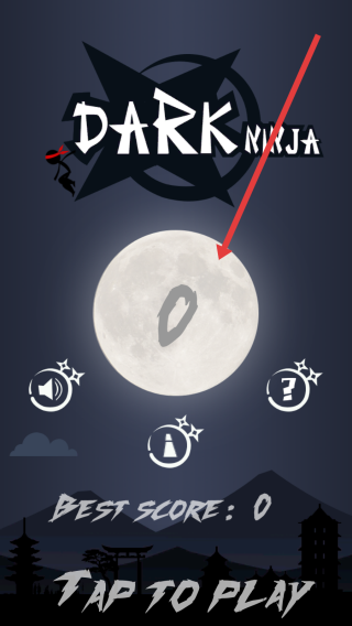 1、點擊TAP-TO-PLAY開啟Dark-Ninja游戲,操控忍者在月夜場景開啟跳躍挑戰(zhàn),初始分?jǐn)?shù)為0,即將開啟冒險之旅。